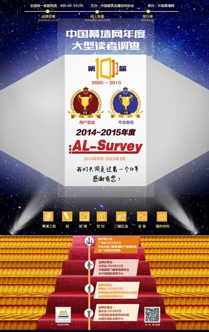 AL-Survey讀者調(diào)查活動(dòng)全稱:中國(guó)幕墻網(wǎng)年度大型讀者調(diào)查暨“我最喜愛品牌”評(píng)選活動(dòng)。(以下簡(jiǎn)稱AL-Survey)我司濟(jì)南天辰鋁機(jī)股份有限公司作為門窗幕墻機(jī)械制造領(lǐng)域的資質(zhì)企業(yè),攜“天辰”品牌,強(qiáng)勢(shì)入圍本次調(diào)查活動(dòng)。通過活動(dòng)參與者的票